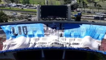 La bandera celeste y blanca, que tiene una medida de 100m x 50m, posee una leyenda en letras negras que dice: "Lio, te quiero. El tango se baila de a dos. Vamos Messi".