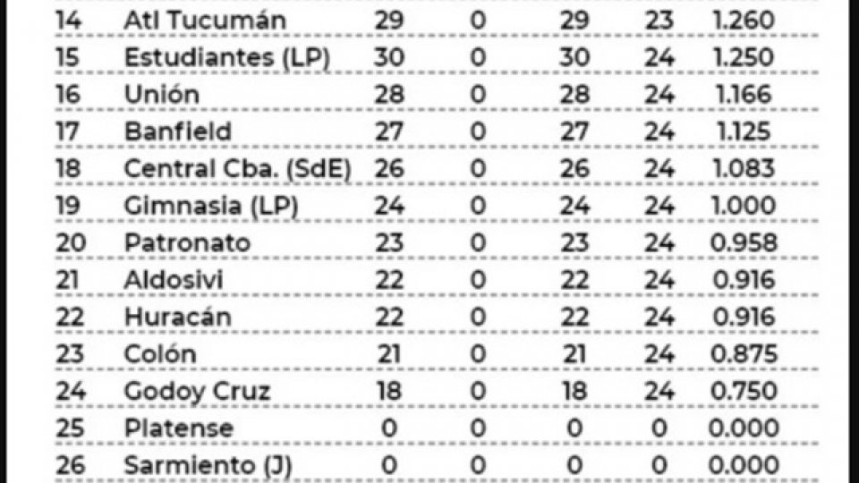 En tanto, los equipos que tendrán que repuntar bastante son Colón, Godoy Cruz, Patronato, Aldosivi y Gimnasia. Comprometidos con el fantasma de la B se mire la tabla que se mire. El equipo paranaense fue beneficiado pero no por los puntos, es que varios clubes quedaron debajo de sus registros.