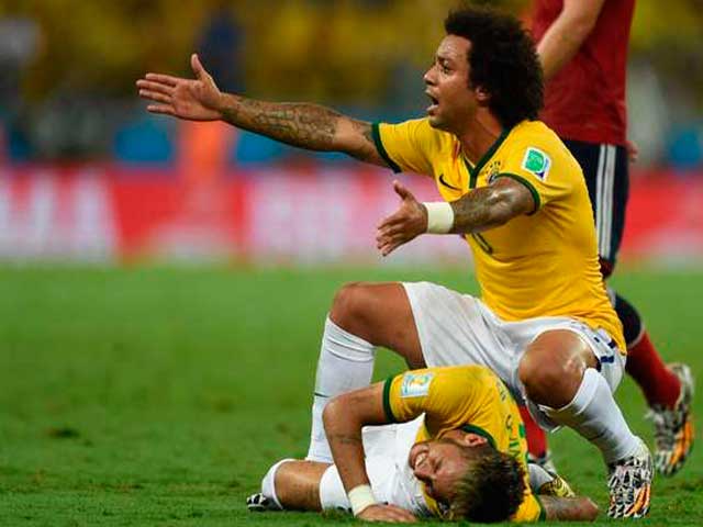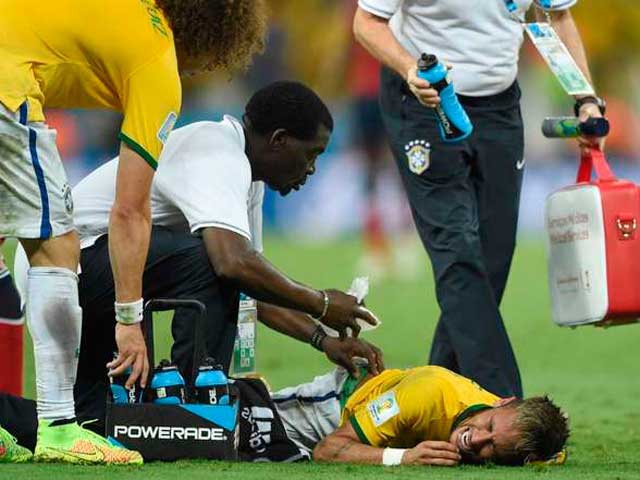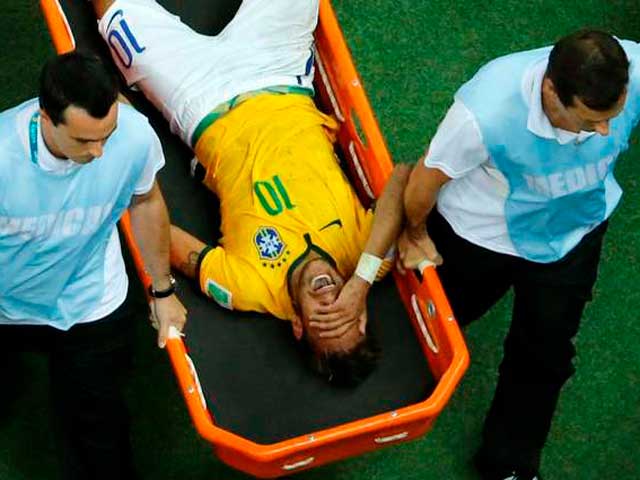 El delantero debió dejar la cancha a tres minutos del final del duelo, luego de recibir un golpe del lateral derecho Juan Camilo Zúñiga en la zona lumbar. Con evidentes gestos de dolor y sin poder moverse, Neymar dejó la cancha en camilla y fue llevado directamente al vestuario. Enseguida decidieron trasladarlo al hospital Sao Carlos de Fortaleza, a donde ingresó con suero y junto al médico principal del plantel, José Luiz Runco.