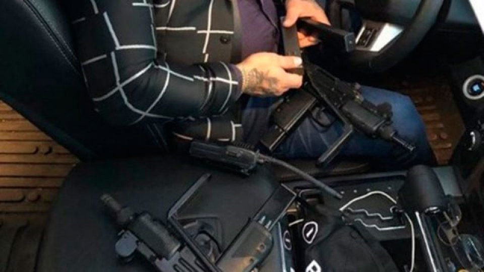En la escena aparecen dos ametralladoras UZI, una sobre su falda y la otra en el asiento del acompañante. La imagen se completa con una gorra, un handy y los dos cargadores de las ametralladoras.