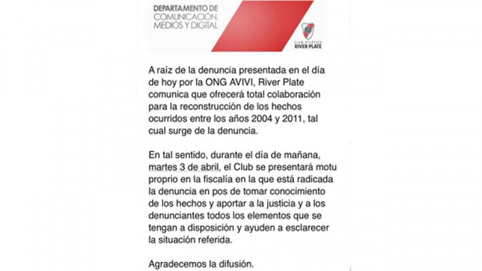 La dirigencia de River emitió un comunicado oficial en referencia a las denuncia por abuso contra menores en la pensión del club, donde se ofrece total colaboración por parte de la institución de Núñez para esclarecer los hechos.