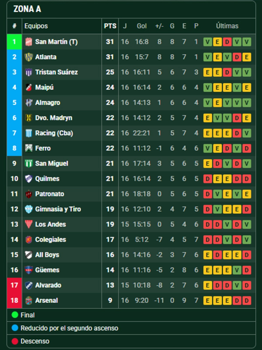 Con este triunfo, el “Ciruja” alcanzó la cima de la Zona A, posición que ahora comparte con Atlanta, que también sumó de a tres en su compromiso de la jornada. El “Bohemio” superó por 1 a 0 a Gimnasia y Tiro de Salta. Gracias a esa victoria, llegó a los 31 puntos y se ubica en lo más alto junto a San Martín.