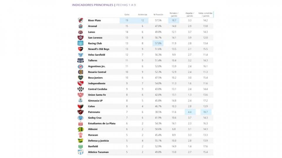 Boca solo tuvo la pelota más que Huracán, en La Bombonera, y que Patronato, en el Presbrítero Bartolomé Grella. Luego, siempre su rival ganó la "batalla de la posesión". Así y todo, tiene apenas un gol en contra y le lleva tres puntos a su escolta. Apenas patea 10,2 veces por partido (de hecho, solo anotó 10 goles en nueve fechas), pero su solidez defensiva le permite que eso sea suficiente para sumar de a tres la mayoría de los casos.