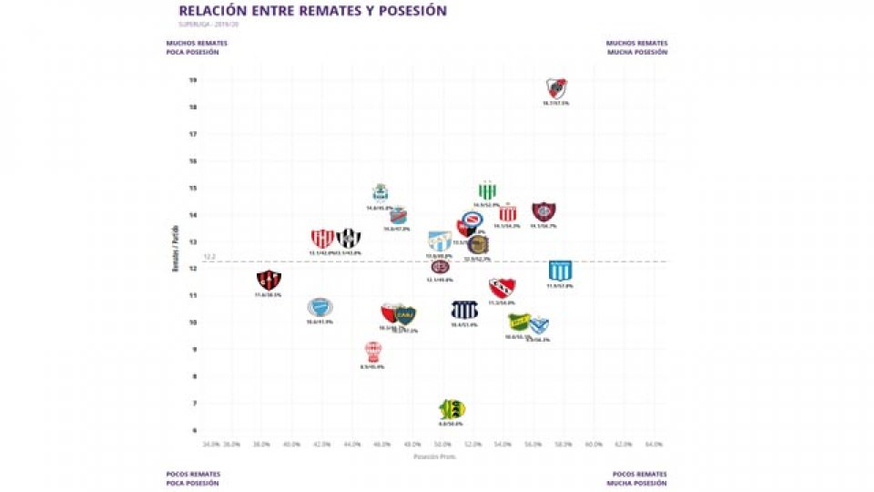 En el actual torneo, de los cinco equipos de arriba de la tabla, River (57,5%), Vélez (56,3%) (dos equipos que suelen hacer de la posesión un culto) superan ampliamente el 50% de tenencia y Argentinos también la tiene más que sus rivales, pero no por tanto, está en un 52%.