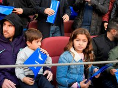 La dupla Messi, que también estuvo presente en el encuentro frente a Inter por Champions, participó del mosaico organizado por los hinchas y celebró los goles del equipo.
