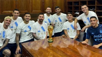 El capitán Lionel Messi encabezó un grupo de jugadores del seleccionado de Argentina que posaron para una foto con la Copa del Mundo ganada en Qatar 2022, en la noche previa al clásico rioplatense con Uruguay por la quinta fecha de las Eliminatorias Sudamericanas.