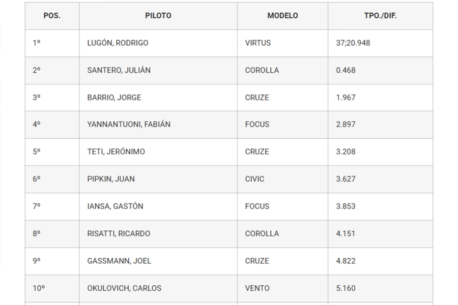 Julián Santero (Toyota Corolla) logró su tercer podio de la temporada y consolidó su liderazgo en el campeonato, aunque ya sabe que en la próxima cita en Río Cuarto deberá cargar nuevamente los 45 kilos de lastre. “No se nos dio la victoria pero es un buen resultado para el campeonato y el triunfo ya va a llegar. Estoy contento porque tuvimos un buen ritmo para tener 45 kilos de lastre”, destacó el mendocino. El entrerriano Joel Gassmann, oriundo de Crespo, llegó noveno.