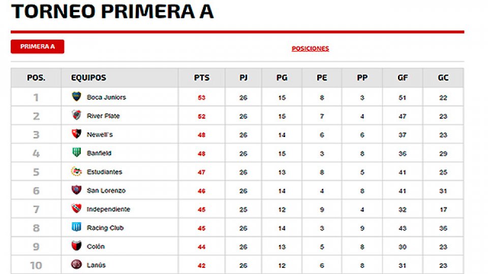 Cuando restan cuatro fechas para el desenlace del torneo de Primera División , Boca se mantiene como líder en solitario, pero ahora con River como único escolta, apenas un punto por debajo, en una espectacular arremetida del equipo de Marcelo Gallardo, que le recortó diez unidades de distancia al líder desde la reanudación del certamen. Atrás se ubican Newell´s y Banfield (48), y el quinto puesto San Lorenzo (46).