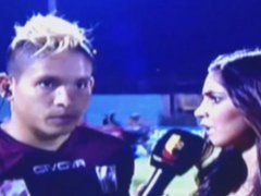 Aquiles Ocanto, jugador de Carabobo, daba una entrevista cuando un hincha de Aragua ingresó al campo de juego y le dio una terrible patada voladora en la espalda que lo dejó de boca al piso.