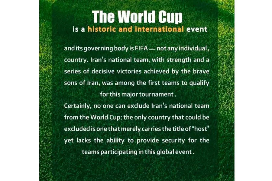 "El Mundial es un evento histórico e internacional, y su organizador es la FIFA, no un solo país. La s elección nacional iraní también se clasificó para este evento con autoridad y mediante victorias consecutivas, convirtiéndose en uno de los primeros equipos en llegar a este gran torneo", comienza el comunicado.