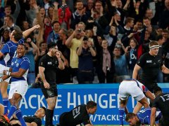 Nueva Zelanda cumplió el trámite ante la débil Namibia, a la que derrotó por 58-12 en el Estadio Olímpico de Londres, en un encuentro correspondiente al grupo C del Mundial, del que también forman parte Los Pumas.