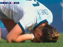 Cometti salió hasta la mitad de la cancha a marcar una futbolista japonesa la golpeó con el codo. Quedó tendida en el piso y recibió asistencia médica: como consecuencia del traumatismo se le cayó un diente.