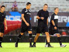 Alrededor de las 18.45, el árbitro Fernando Rapallini pisó por segunda vez el césped y encontró lagunas por todas partes. "Hay agua debajo del césped, algo que no se ve en televisión", dijo el árbitro al volver al vestuario. Media hora más tarde, explicaba en la transmisión de El Trece lo que se veía venir: que en esas condiciones era imposible que se jugara el partido. Así, la suspensión pareció lo más adecuado.