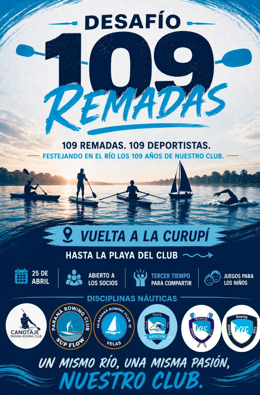 En el marco de su 109° aniversario, el Paraná Rowing Club lleva adelante este sábado 25 de abril una propuesta deportiva y comunitaria que pondrá al río como escenario central: el Desafío "109 Remadas".