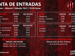 La venta de entradas para este encuentro se realizará en dos días, según informó el Departamento Prensa del Rojinegro: arrancará el Viernes de 18 a 21 horas y el mismo Sábado, desde las 11 hasta las 19 horas (20 minutos antes del encuentro).