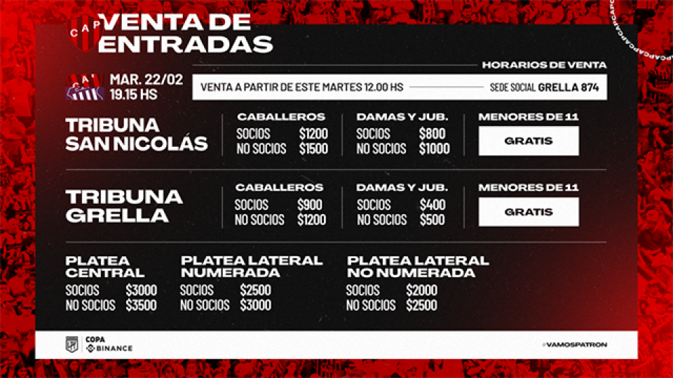 Además, para este partido la Comisión Directiva ha dispuesto que los menores de hasta 11 años ingresen de manera gratuita, presentando DNI en las bocas de acceso correspondientes a las tribunas San Nicolás y Grella. Por otro lado, en las plateas todos los menores de 5 a 11 años abonarán $1000 (mil pesos).