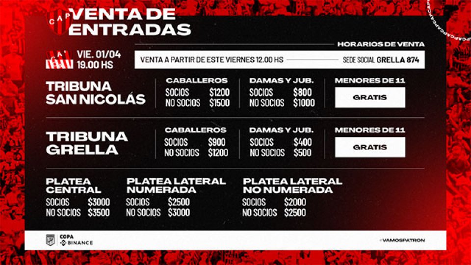 Luego, desde las 16:30 horas hasta el comienzo del partido (19 horas), la venta continuará en las boleterías ubicadas en la intersección de Ayacucho y San Nicolás, tanto para socios como no socios, debido al operativo de seguridad.