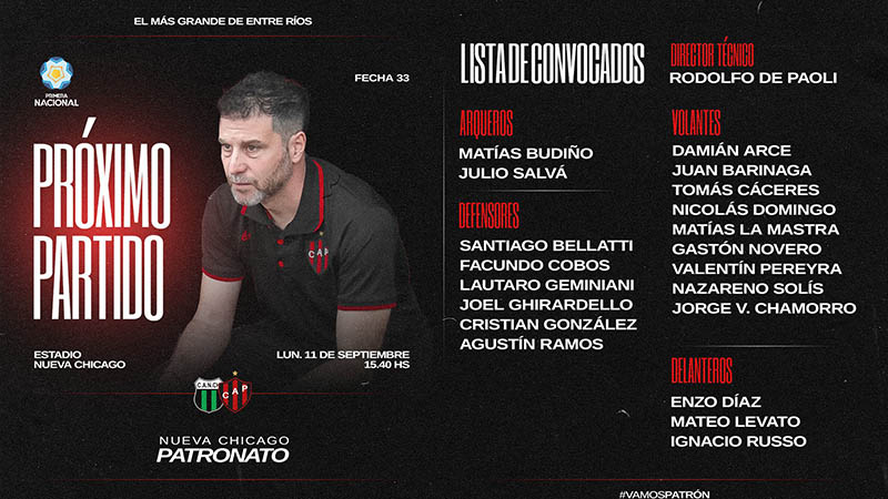 Patronato enfrenta a Nueva Chicago como visitante este lunes, a partir de las 15:40 horas, en un cotejo correspondiente a la fecha 33 de la zona A del campeonato de ascenso en la Primera Nacional.