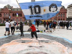 Entre las pancartas llamó la atención una con la cara de Maradona y la inscripción de la canción de Rodrigo "Nació la mano de Dios, llenó alegría en el pueblo".