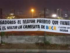 Pasadas las dos y media de la madrugada, se vio colgada la bandera en una reja en las adyacencias del estadio. "Jugadores, el mayor premio que tienen ustedes es vestir la camiseta de Boca. Y están en deuda", se lee en letras grandes.
