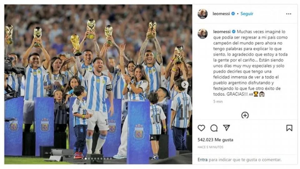 "Muchas veces imaginé lo que podía ser regresar a mi país como campeón del mundo pero ahora no tengo palabras para explicar lo que siento, lo agradecido que estoy a toda la gente por el cariño", escribió esta mañana en su cuenta de Instagram, horas después de la multitudinaria fiesta.