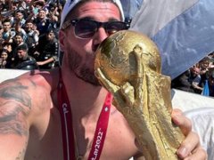 De Paul subió varias fotos con la Copa del Mundo, en compañía de Lionel Messi, Nicolás Otamendi, Ángel Di María y Exequiel Palacios, mientras a sus espaldas un grupo nutrido de hinchas buscó un saludo de sus ídolos futboleros.