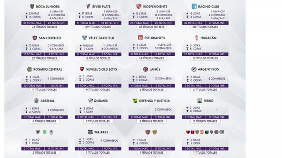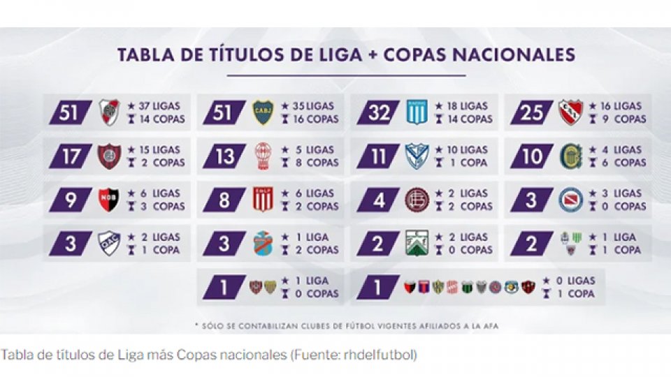 Si se toma la tabla de Títulos Locales (donde se agrupan Torneos de Liga y Copas Nacionales), Boca Juniors tiene 51 estrellas y comparte la cima con River Plate. En tanto que Racing Club ahora asciende a 32, seguido por Independiente (25) y San Lorenzo (17), completan los cinco clubes más ganadores del país.