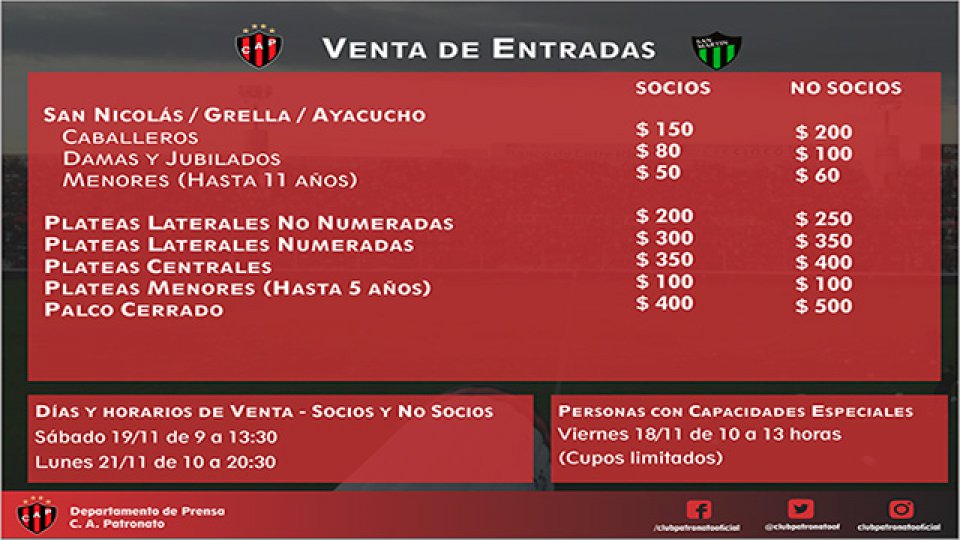 En tanto, se precisó que "las personas con capacidades especiales podrán buscar sus entradas el día viernes de 10 a 13 horas en la Secretaría del Club (Cupo limitado de 30 remanentes)".