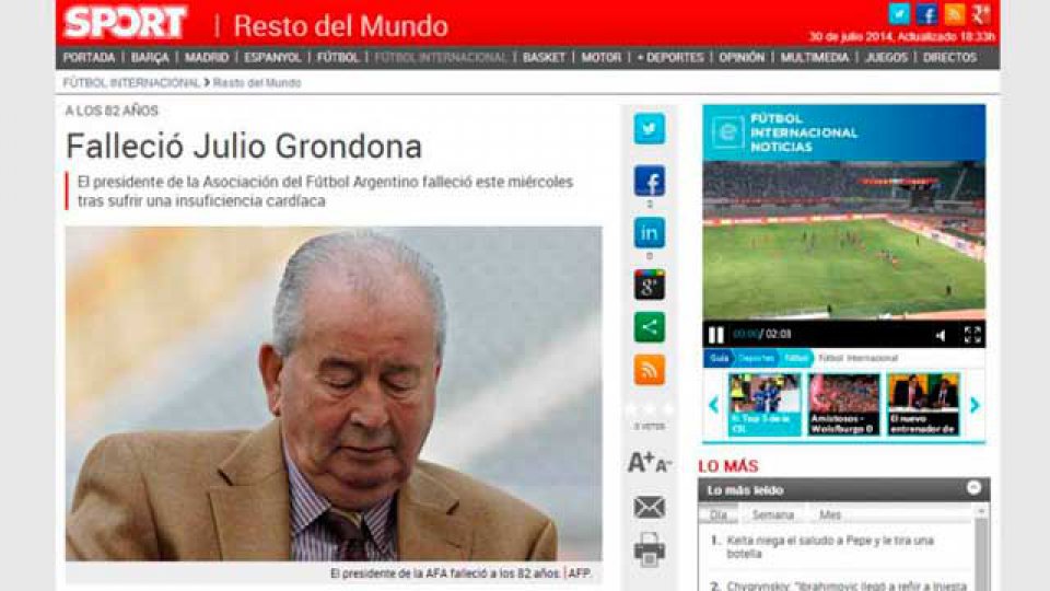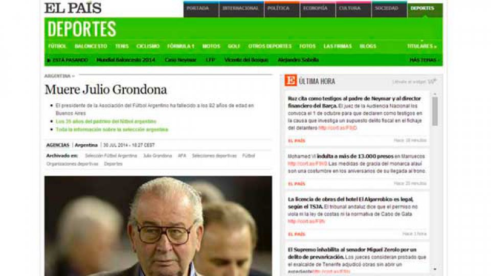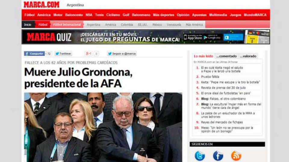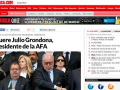 El portal deportivo español Marca reflejó que "Julio Grondona, presidente de la Asociación de Fútbol Argentina, murió este miércoles tras sufrir una insuficiencia cardiaca y verse agravada posteriormente en el hospital".