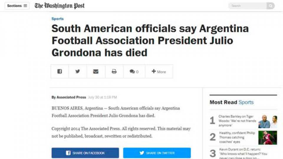 En una breve información, The Washington Post, de Estados Unidos, tituló: "Funcionarios sudamericanos dicen que el presidente Asociación de Fútbol Argentino, Julio Grondona, ha muerto".