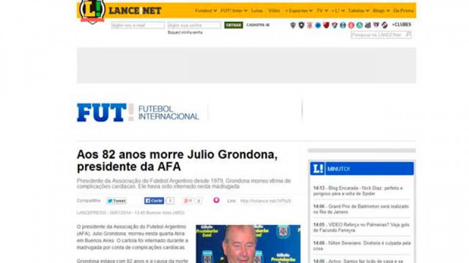 "El presidente de la Asociación de Fútbol Argentino desde 1979, Grondona, murió víctima de complicaciones cardíacas", destacó el portal Lance (Brasil), y completó que "fue designado presidente de la AFA por la dictadura militar que gobernó la Argentina entre 1976 y 1983. A pesar el retorno de la democracia, permaneció en el cargo que los militares le habían entregado".