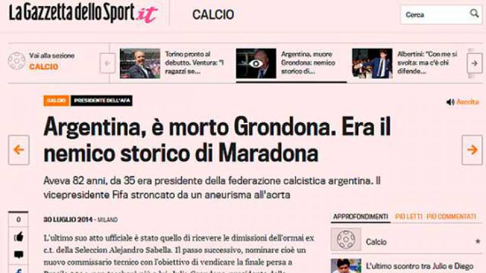 Por otro lado, La Gazzetta dello sport (Italia) publicó: "Murió Grondona. Era el enemigo histórico de Maradona. Tenía 82 años, y durante 35 fue presidente de la Asociación del Fútbol Argentino".