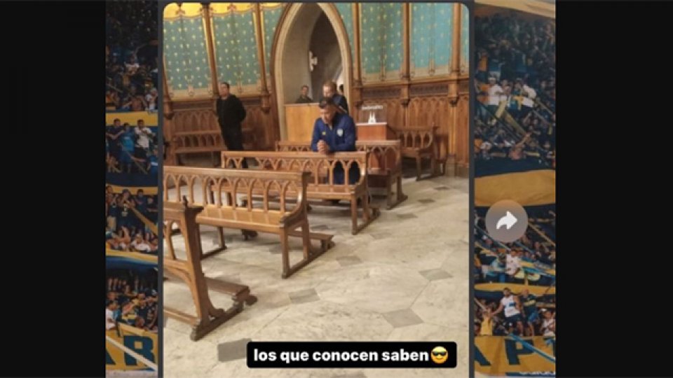 El técnico de Boca fue a la icónica iglesia y fue fotografiado por un hincha mientras estaba arrodillado, con las manos en posición de rezo y con la indumentaria del club xeneize. Este domingo se jugará el Superclásico.