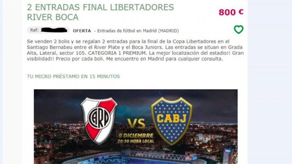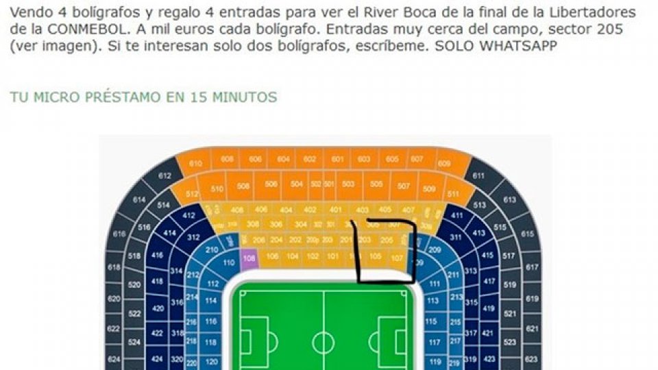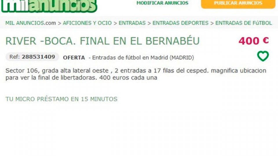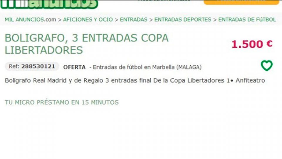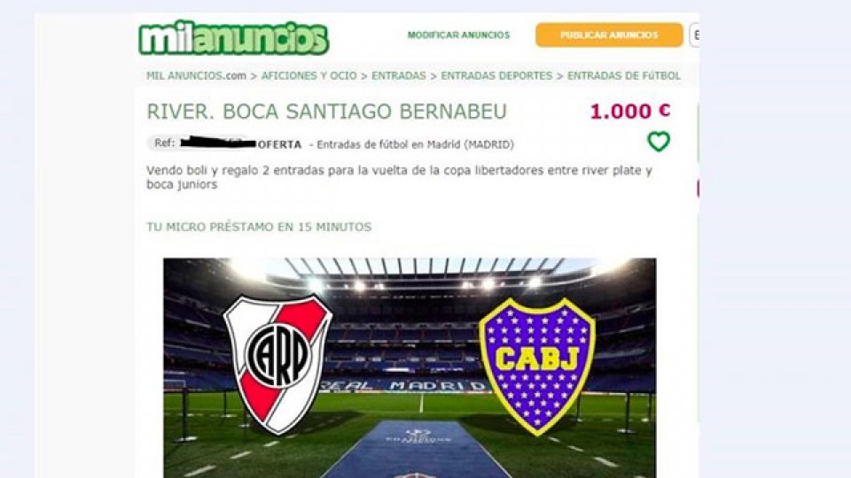 En uno de los medios de compra-venta más conocidos de España, se pudo apreciar cómo algunos individuos pusieron a disposición sus lugares para la gran final entre River y Boca. Los poseedores de los tickets publicaron lapiceras a la venta con "una entrada de regalo" para asistir al Santiago Bernabéu a vivir el duelo entre la entidad de Núñez y el club de La Ribera. Los supuestos "bolígrafos" cuestan entre 250 y 1500 euros.