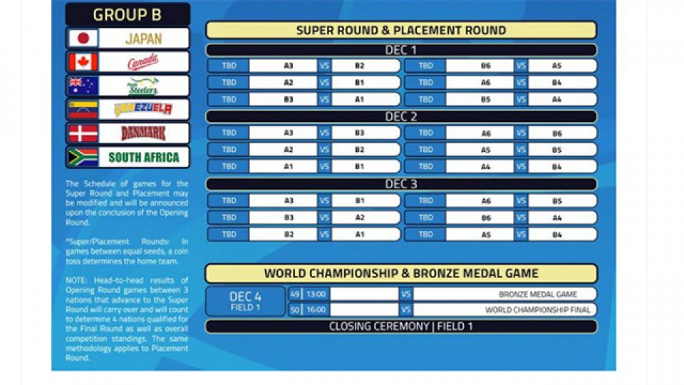 Los dos mejores equipos de la Súper Ronda, que se jugará del 1 al 3 de diciembre, competirán por el título de Campeones Mundiales de Softbol Masculino, mientras que los equipos número tres y cuatro jugarán por la medalla de bronce. La Final del Campeonato Mundial está programada para el 4 de diciembre a las 16:00, precedida por el Juego de la Medalla de Bronce a las 13:00.