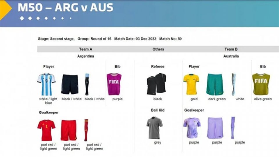 Para ese duelo está definido qué camiseta usará el equipo de Lionel Scaloni: será la titular, con tradicionales bastones verticales celestes y blancos. Esa casaca es la que utilizó para los primeros dos partidos de la Copa del Mundo. En tanto, en el tercero, del pasado miércoles, estrenó la alternativa, de color violeta.