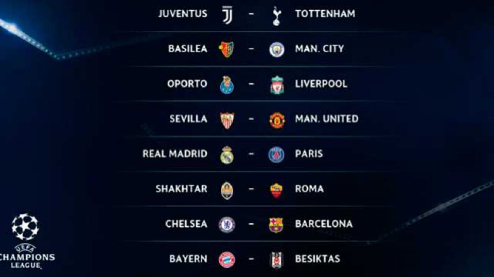 Los otros emparejamientos serán Manchester United-Sevilla, Liverpool-Porto, Bayern Múnich-Besiktas y Shakhtar-Roma. Los octavos se jugarán en eliminatorias de ida y vuelta entre el 13 de febrero y el 14 de marzo.