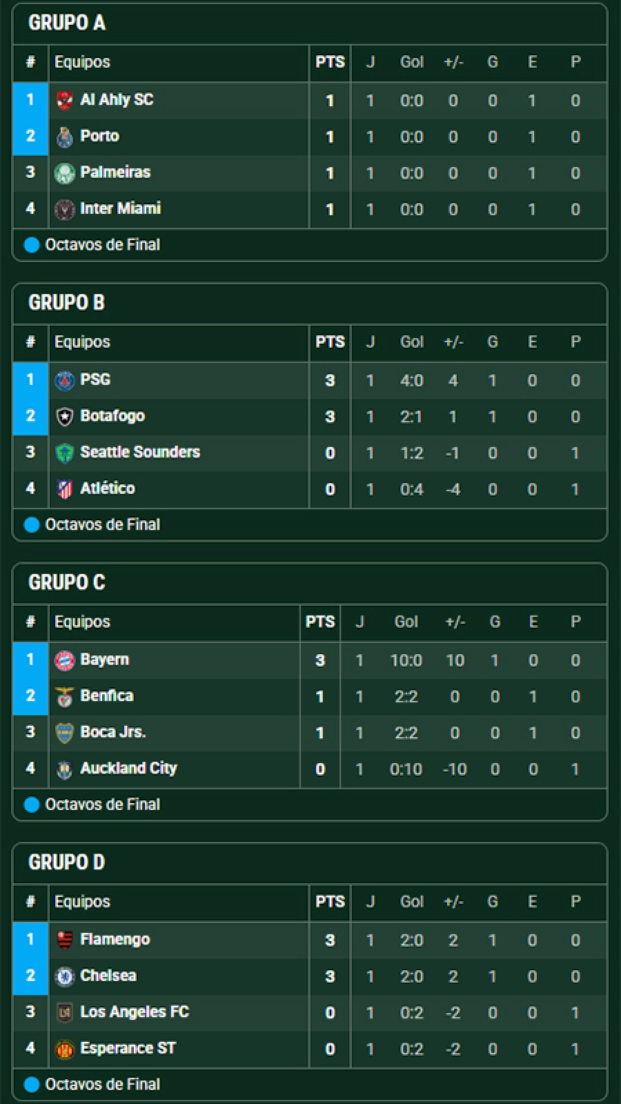 La actividad de la jornada se abrió en el Lincoln Financial Field de Philadelphia, con la victoria del Manchester City 2-0 ante el Wydad AC de Marruecos, que llegó a este certamen tras ser campeón de la Champions League de África en la temporada 2021 y 2022.