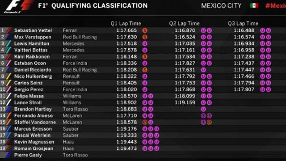 El alemán Sebastian Vettel, con Ferrari, logró la pole position para el Gran Premio de México, que se desarrolla en el Autódromo Hermanos Rodríguez, y relegó a Max Verstappen y Lewis Hamilton al segundo y tercer lugar, respectivamente.
