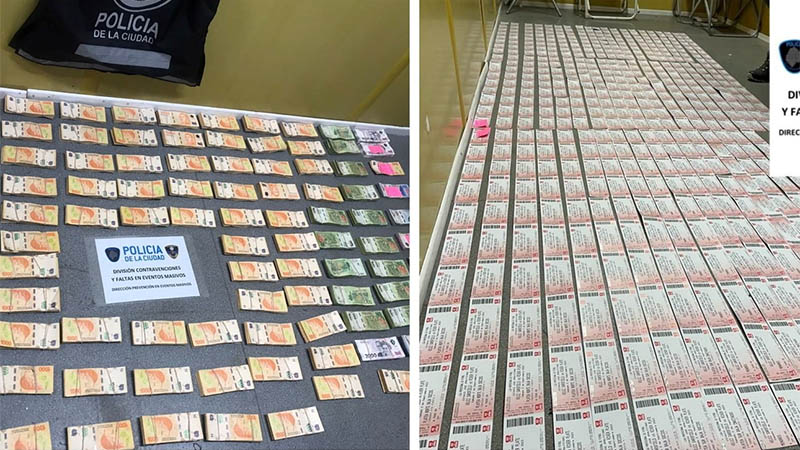 Unos 10 millones de pesos y un lote de 510 entradas para la venta ilegal fueron secuestrados anoche por la policía de la Ciudad de Buenos Aires en la previa del partido entre Vélez y River en Liniers por la Copa de la Liga Profesional.