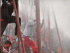 Sin embargo, a los 24 minutos, los hinchas redoblaron la apuesta, rompieron una reja que les permitió pasar desde la popular a la platea Miravé, subieron al alambrado ubicado detrás de los bancos de suplentes y arrojaron piedras y otros proyectiles.