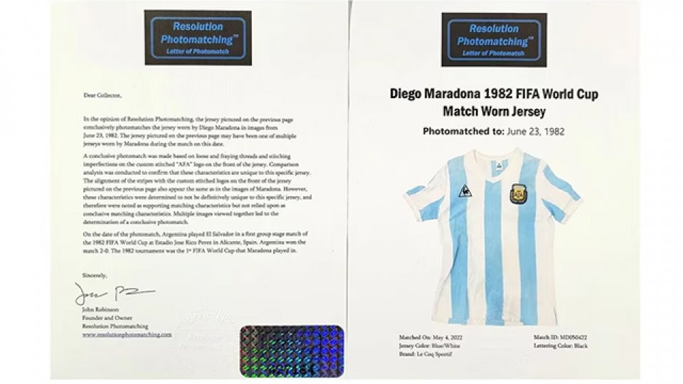 "Además de la Carta de Resolución de Photomatch, el postor ganador también recibirá una carta manuscrita de Andrés do Campo, gerente de equipo de Argentina, afirmando el origen de la camiseta, así como un conjunto de credenciales que verifican su posición en 1982", cita la página donde se lleva a cabo la licitación.