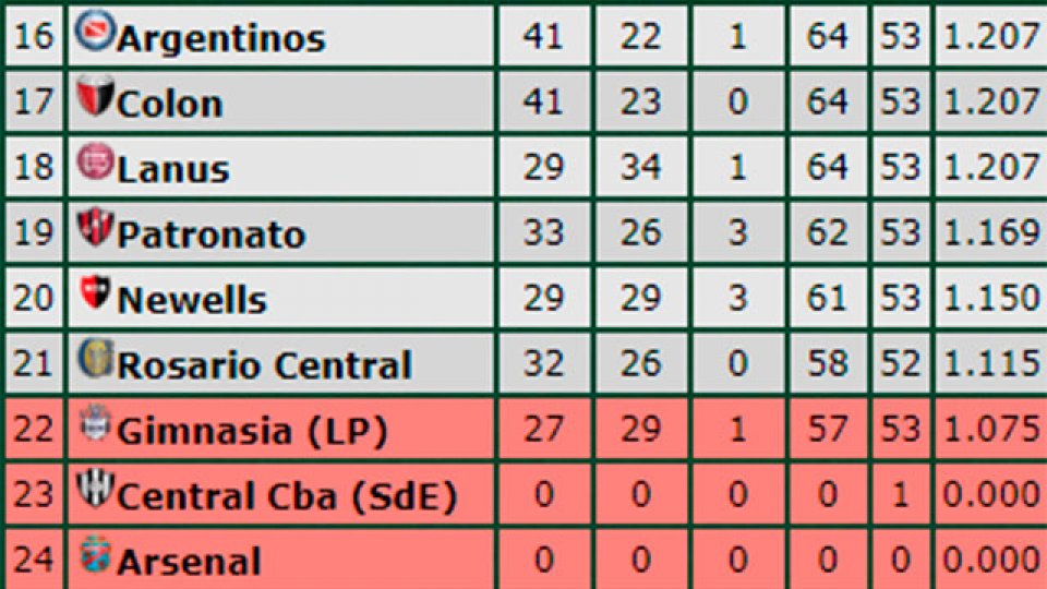 Teniendo en cuenta que, por el cambio en el reglamento, al final de la temporada descenderán tres equipos, y la Copa de la Superliga también sumará para los promedios. Así las cosas, en este momento quedaron en la zona roja Gimnasia, Central Córdoba de Santiago del Estero (que perdió este domingo en su debut ante un Newell's que salió momentáneamente del fondo) y Arsenal (que jugará el lunes ante Banfield).