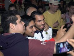 Carlitos recibe el cariño de sus fanáticos en Ezeiza antes de partir.