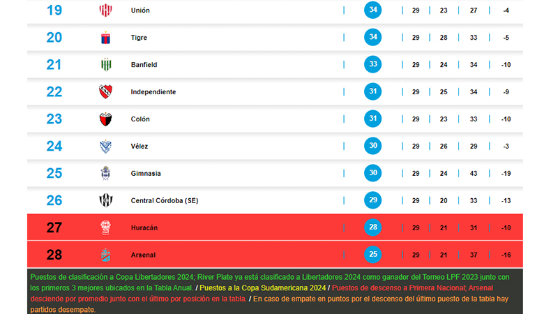 Arsenal está seriamente comprometido debido a que está en la última posición en la tabla de los promedios y alejado del resto, mientras que por la tabla acumulada hoy el que está descendido es Huracán después de la derrota ante Talleres. Un escalón por arriba esta Central Córdoba de Santiago del Estero.
