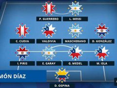 Lionel Messi, Javier Mascherano y Ezequiel Garay fueron los representantes argentinos más destacados. Medel, Isla y Valdivia los chilenos, Cueva y Guerrero los peruanos, Piris y Derlis González por Paraguay y David Ospina completa defendiendo el arco por haber sido figura ante los de Gerardo Martino. En cuanto al entrenador, el seleccionado fue Ramón Díaz, que guió a la Albirroja a la semi tras superar a Brasil por penales y será el próximo rival de la Albiceleste.