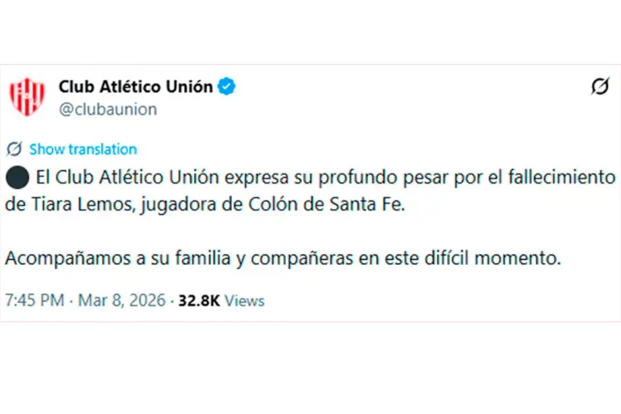 “El Club Atlético Unión expresa su profundo pesar por el fallecimiento de Tiara Lemos, jugadora de Colón de Santa Fe. Acompañamos a su familia y compañeras en este difícil momento”, publicó el club.