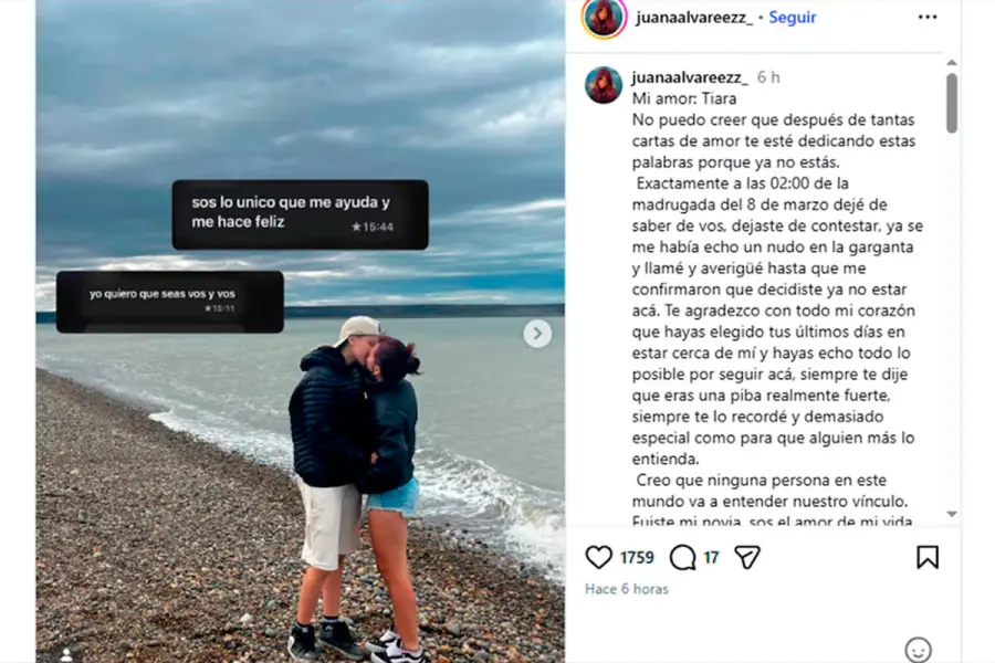 En su mensaje, también expresó el vacío que dejó la partida de la joven. “Se me hace un nudo en el pecho cada vez que intento calmarme y dejar de pensar en lo que pasó. Si pudiera elegir sin cambios drásticos mi destino, sin duda me iría mil veces con vos sin importar nada. Te amo con todo lo que quedó de mí, amor mío”.