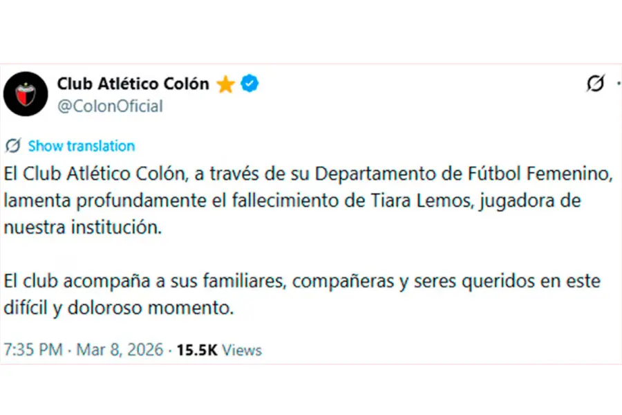 Desde el club sabalero expresaron su pesar por la pérdida de la futbolista y enviaron un mensaje de acompañamiento a su entorno más cercano. “El Club Atlético Colón, a través de su Departamento de Fútbol Femenino, lamenta profundamente el fallecimiento de Tiara Lemos, jugadora de nuestra institución. El club acompaña a sus familiares, compañeras y seres queridos en este difícil y doloroso momento”, señalaron.