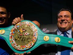 "Se usaron 3.017 esmeraldas en la preparación del cinturón, tiene un contenido de plata, un contenido de oro, la piel es de la marca Ferrari y las monedas son de oro con los rostros de Pacquiao, Mayweather, Muhammad Alí y de José Sulaimán", agregó.